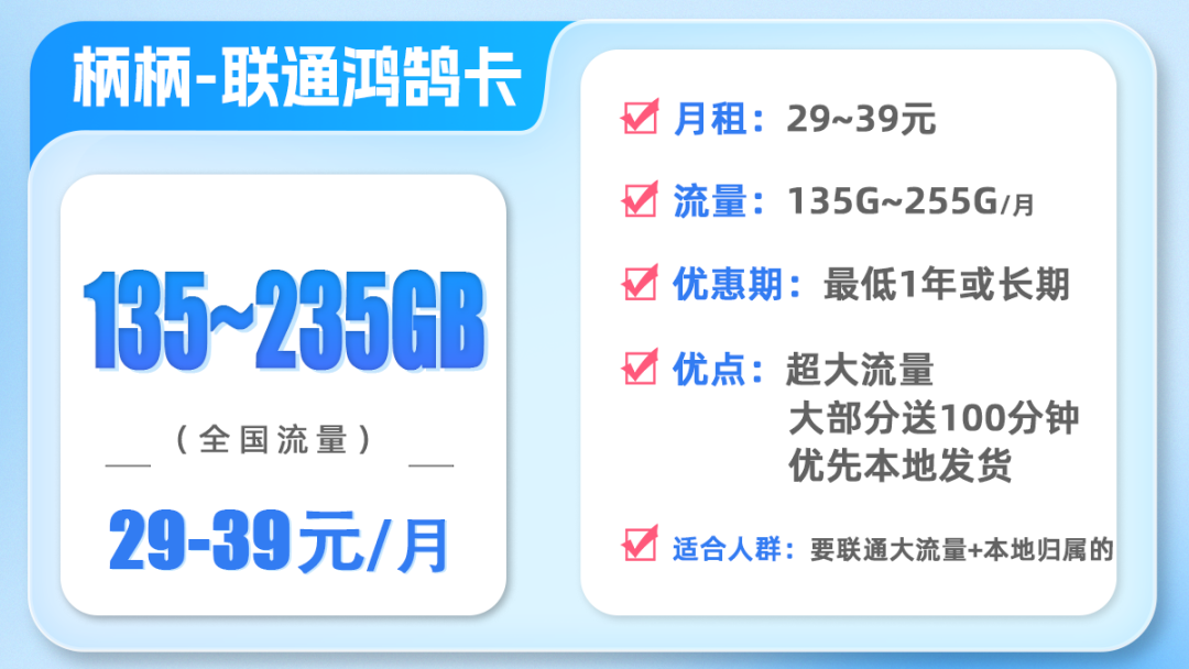 联通鸿鹄卡是一张盲盒卡品,月租在29~39元之间,每月流量在135G~235G之间,大部分还有免费通话。