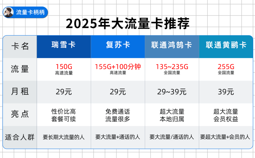 这期柄柄推荐4款大流量卡,瑞雪卡凭借150G套餐自动续直接位列第一,属于大流量+通话短信的全面卡。