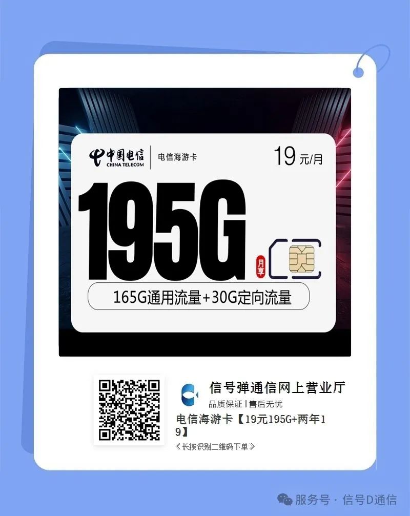 长按下方图片识别二维码免费办理!产品套餐:19元195G+两年19